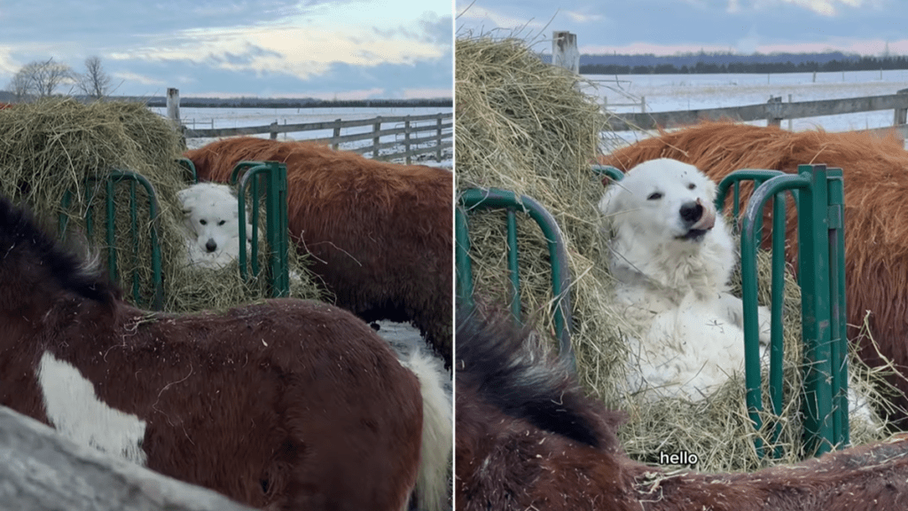 Working on a ranch is usually pretty gritty, but Birdie has managed to find a loophole for her morning chores. This fluffy Great Pyrenees decided that walking through the freezing mud for a meal was not on her agenda. A funny video posted by @laurelysebaert shows exactly how this “lil princess” spent her morning. Instead of heading to the barn, she claimed a hay feeder as her personal bed until room service arrived. It’s a bold move, but when you’re that cute, you usually get away with it.