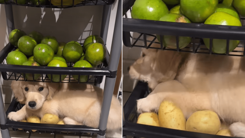 Take a look at this golden retriever puppy who turned a kitchen fruit basket into his nap spot: