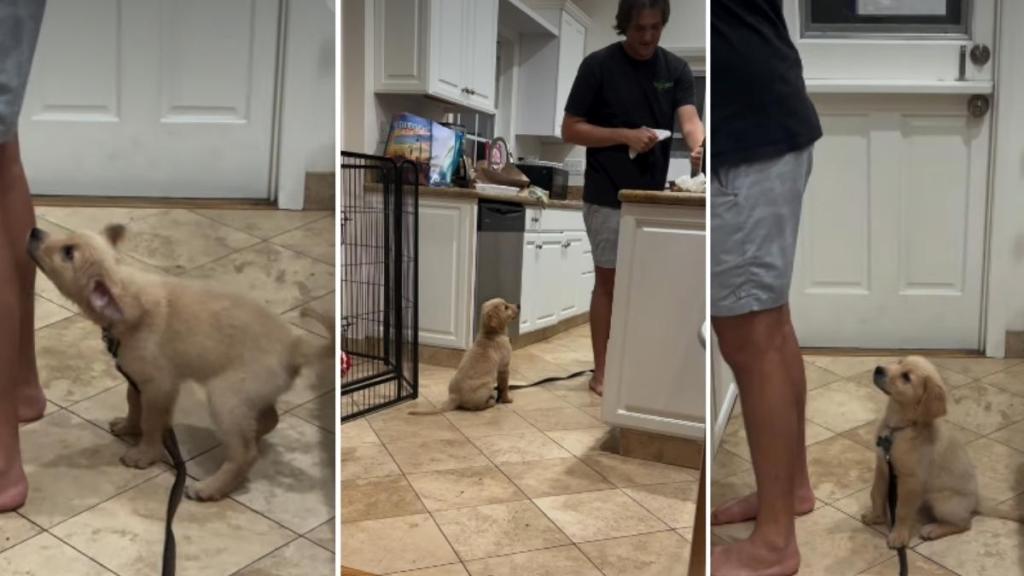 It begins with the pup sitting on the floor of the kitchen with his long leash dragging on the floor with him. He sits behind his favorite human, who is busy with something on the kitchen counter. It looks like he is preparing either George’s food or some other meal. While the dog dad is engrossed in household chores, the tiny Retriever cannot let himself be away from the man.