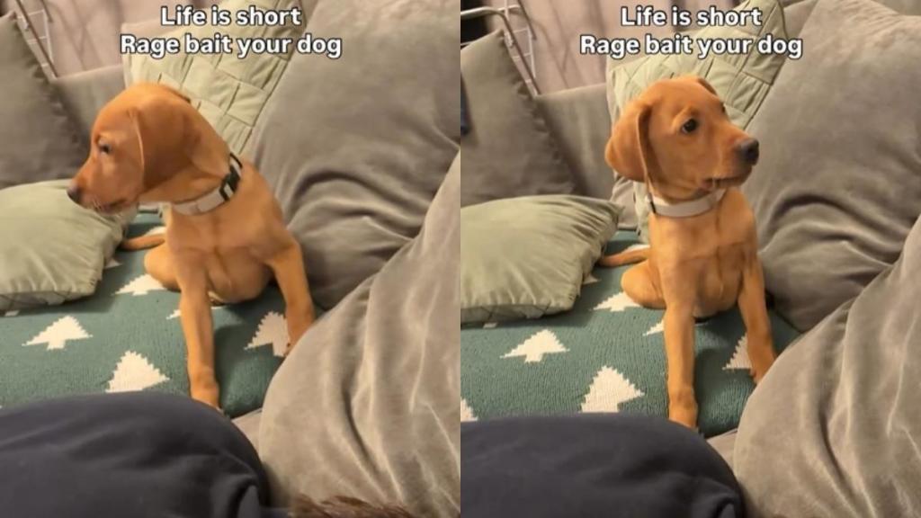 A Vizsla Labrador mix puppy named Finn’s hilarious Instagram video from @finn.thevizslador is winning the internet after his owner decided to “rage bait” him in the funniest way possible. In the clip, the pup lies flat on his belly on a couch, keeping his chin low. His owner mirrors him, lying on his stomach on the same couch, with his face turned away from the puppy as he prepares to unleash pure chaos.